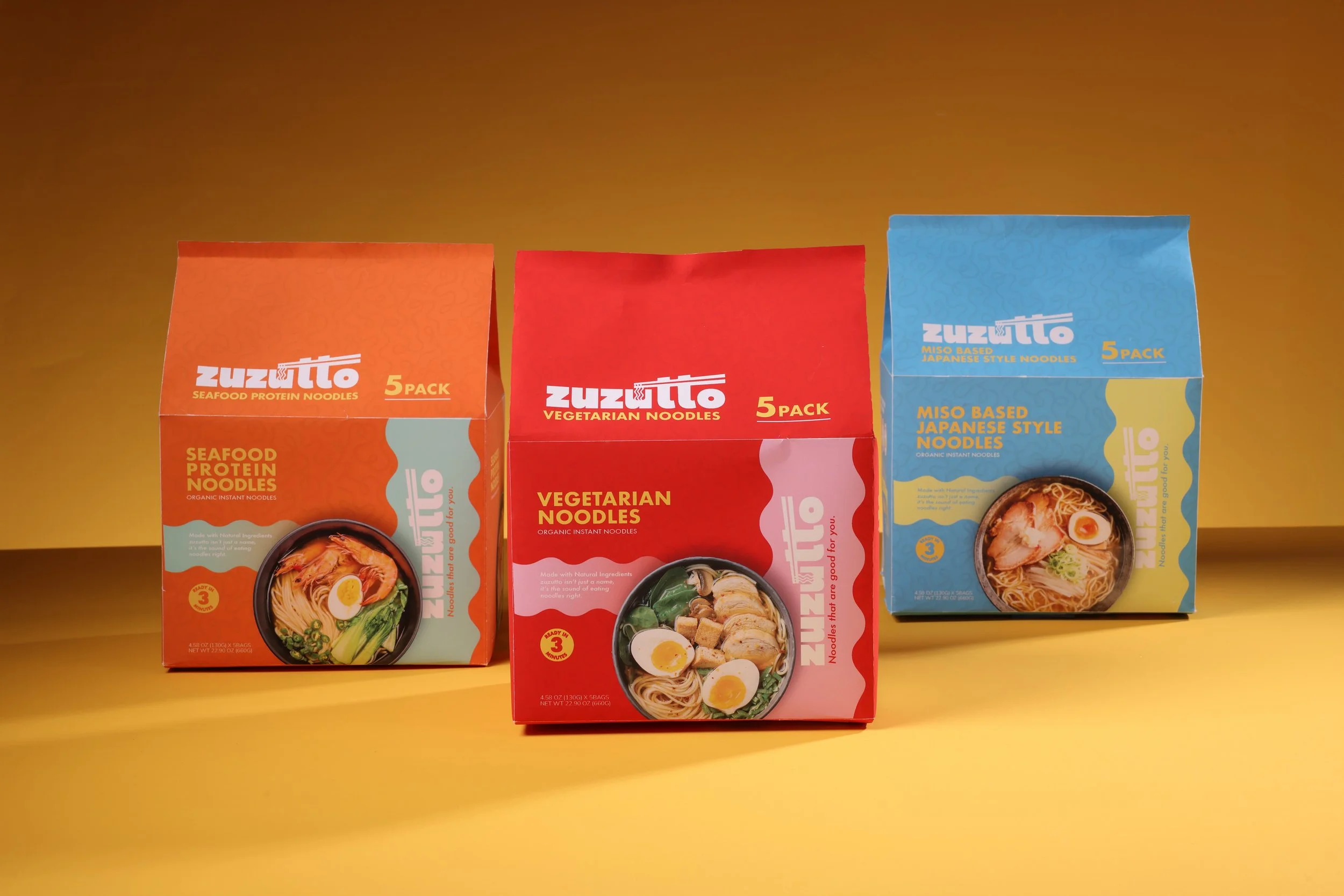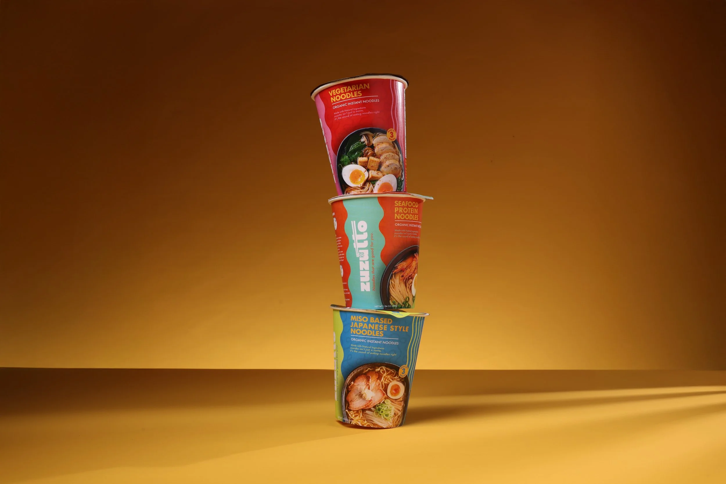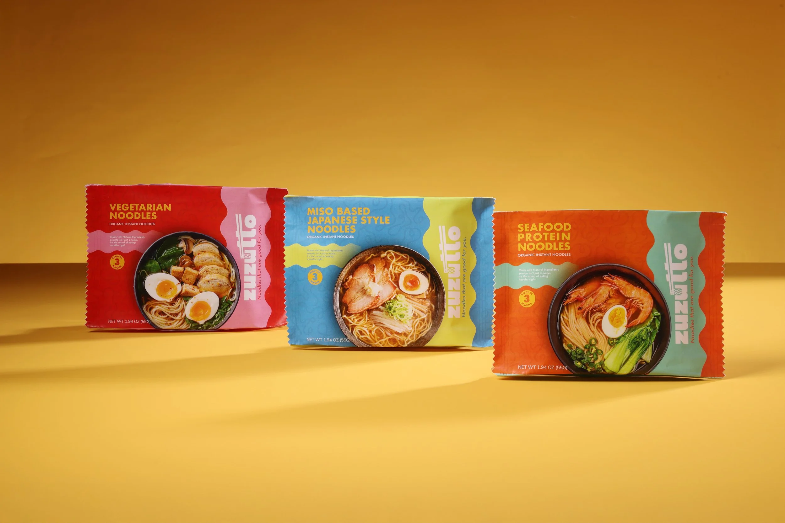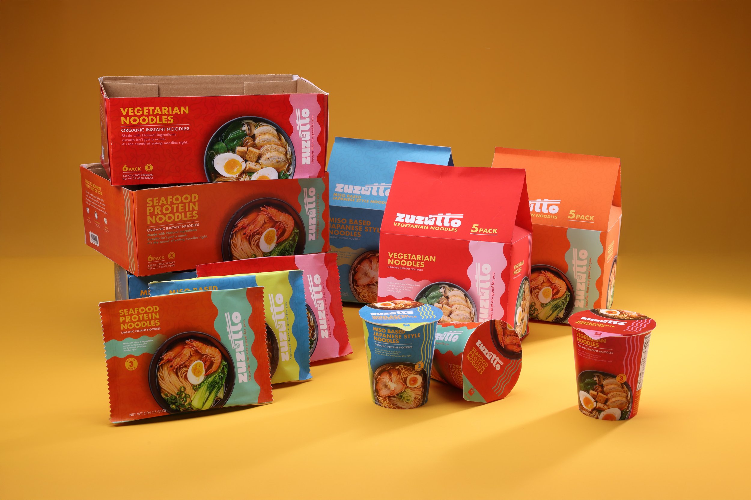 Zuzutto repositions instant noodles as a modern comfort food inspired by the roots of Nagasaki Champon. Bright, contemporary colors and clean design communicate freshness, flavor, and trust. The visual system extends across cup noodles, flat noodle packaging, multi-packs, and retail displays, creating a vibrant identity that balances health, convenience, and indulgence.